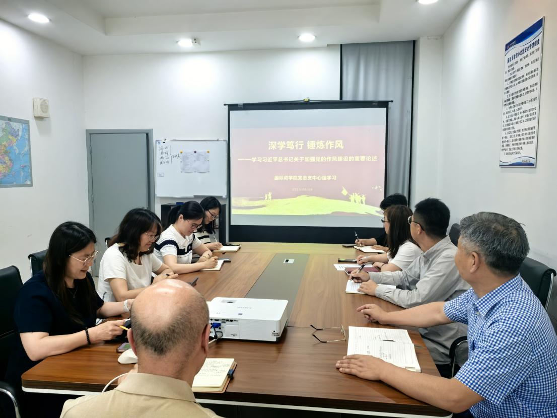 为深入学习贯彻习近平总书记关于党的作风建设的重要论述,进一步推动党的作风建设常态化长效化,6月9日下午,国际商学院党总支举办“深学笃行 锤炼作风——学习习近平总书记关于加强党的作风建设的重要论述”中心组理论学习会,学院班子成员、总支委员、支部书记及各系主任参加了本次学习会。本次中心组理论学习由学院党总支委员张静同志领学。