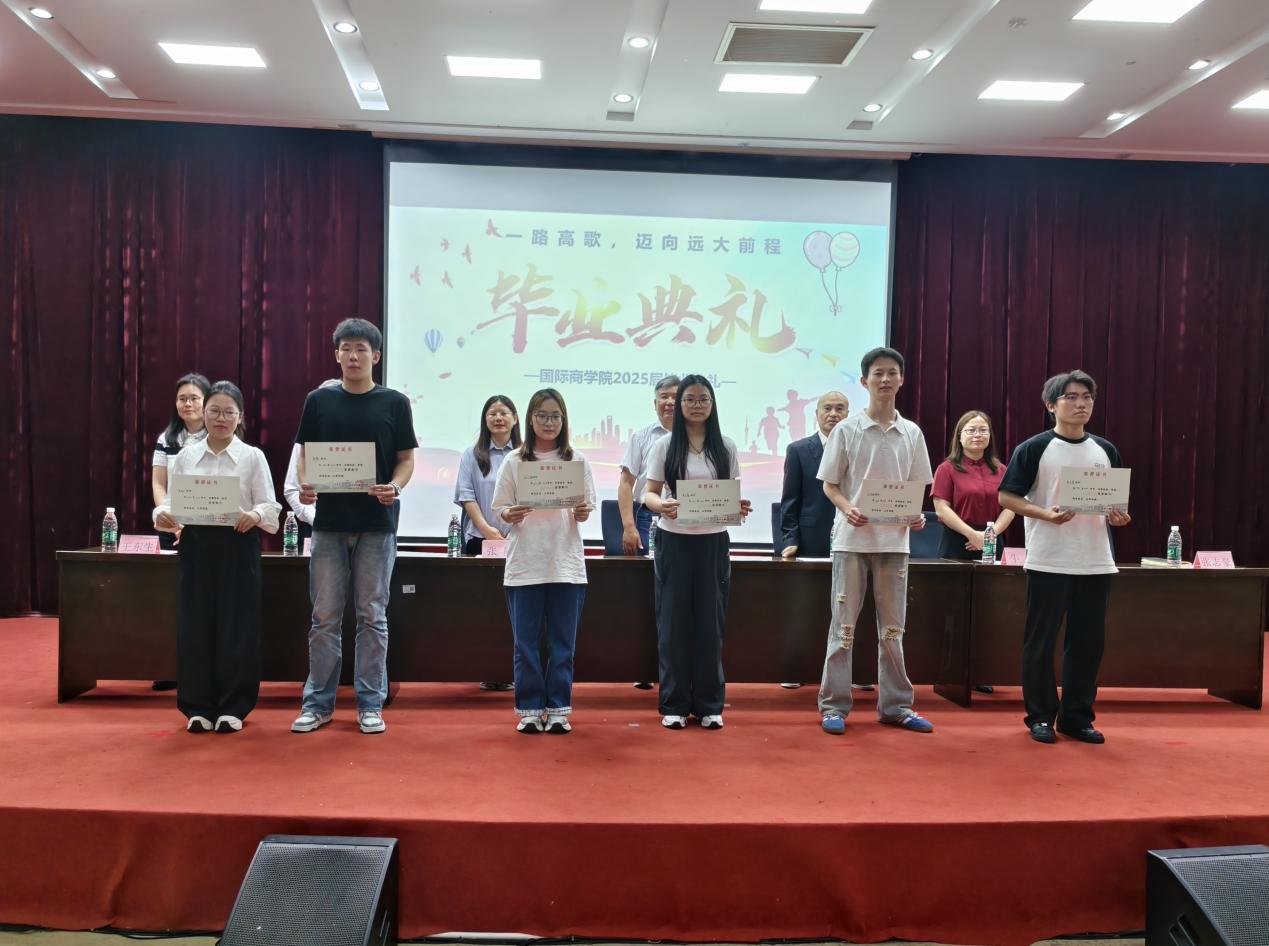 为落实立德树人根本任务,表彰先进,树立典型,充分发挥优秀毕业生的示范激励引领作用,国际商学院评选出吴祥铭等30位优秀毕业生。学院党总支书记王则斌、院长乔桂明、常务副院长张静、副院长牛伟、副院长王东生、副院长顾金峰为优秀毕业生代表颁发荣誉证书,希望他们带着这份荣耀,继续在人生的道路上奋勇前行,书写属于自己的辉煌篇章。