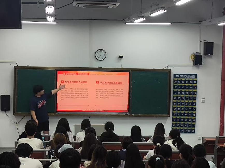 在讲解过程中,黄宏玲同学着重强调新思想对青年成长的指引作用,鼓励同学们从党史中汲取智慧和力量,坚定理想信念,将个人发展与国家命运紧密相连。互动环节,同学们积极提问、踊跃发言,就新思想在日常生活和学习中的实践应用分享见解、交流心得。