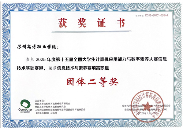 信息技术与素养赛项 | 团体奖 | 苏州高博职业学院 | 二等奖 |