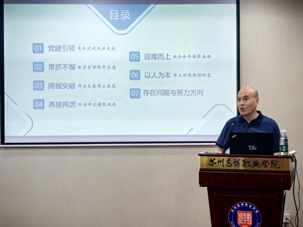 首先,乔桂明院长对本学期学院的各项工作进行总结,他从“党建引领:思政建设走深走实”、“常抓不懈:教学管理稳中求进”、“跨越突破:师生大赛锦上添花”、“再接再厉:科学研究蔚然成风”、“迎难而上:校企合作推陈出新”、“以人为本:学工团建精彩纷呈”六个方面,全面回顾了本学期学院的各项工作。在党建方面,学院党委坚持以高质量党建引领高质量发展,持续巩固拓展主题教育成果。通过严格落实“三会一课”、精心组织主题党日活动、启动学业帮扶仪式等,将立德树人根本任务融入教育教学全过程,筑牢师生思想根基。在教学管理方面,扎实推进学院的专业建设,持续优化课程体系和教材建设,强化教学过程监控与质量评估,学生学习效果稳步提升,教学运行平稳有序。在师生大赛方面,学院在2025年省职业技能大赛中获得奖项5项,其中企业经营沙盘模拟赛项取得了第一名的成绩,在各类高水平学科竞赛和创新实践活动中实现新跨越,战果硕硕。在科研方面,举行多场学术讲座和商科学术交流会,申报各级各类科研课题多项,学术影响力持续增强,为学科发展注入强劲动能。在校企合作方面,“亚湾”酒旅订单班逐步推进,“新芽”直播电商就业帮扶项目落地,产教融合不断地走深走实。在学团工作方面,学工团队坚守育人初心,精心组织开展了涵盖思想引领、学风建设、心理健康、志愿服务等主题鲜明、形式多样的活动,学生综合素质得到全面提升,校园文化活力充分迸发。