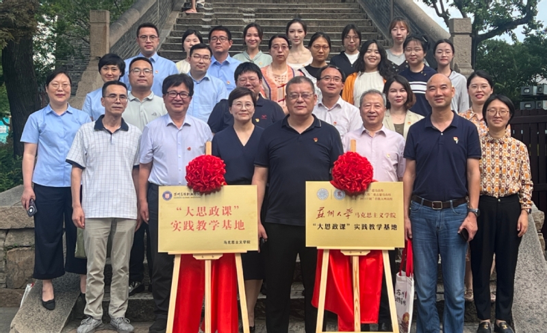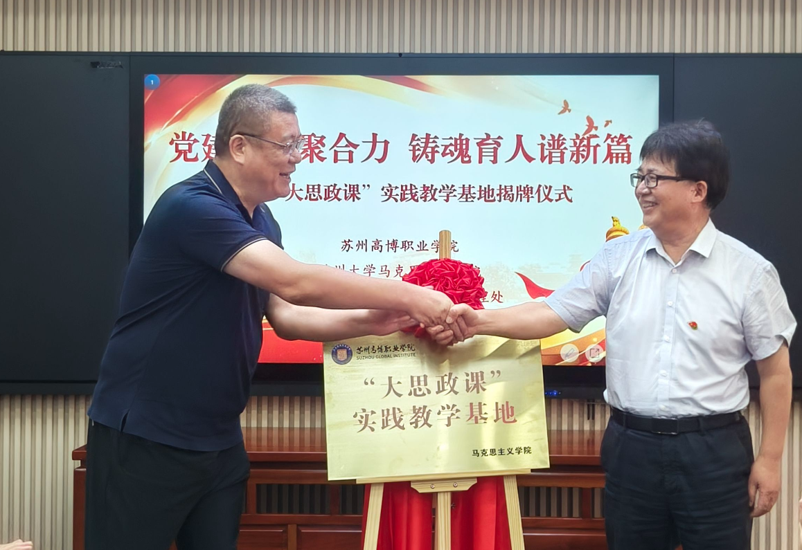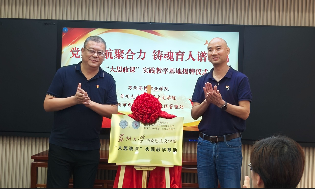 苏州大学马克思主义学院副院长茆汉成与苏州虎丘山风景区管理处党总支书记孙剑锋共同为“苏州虎丘山风景区与苏州大学马克思主义学院共建‘大思政课’实践教学基地”揭牌,我校校长助理兼人文社会科学学院党总支书记吴建明与孙剑锋为“苏州虎丘山风景区与我校人文社会科学学院党总支共建‘大思政课’实践教学基地揭牌。两块牌匾熠熠生辉,标志着“高校理论引领+景区资源支撑+职院实践转化”的协同育人体系正式落成。