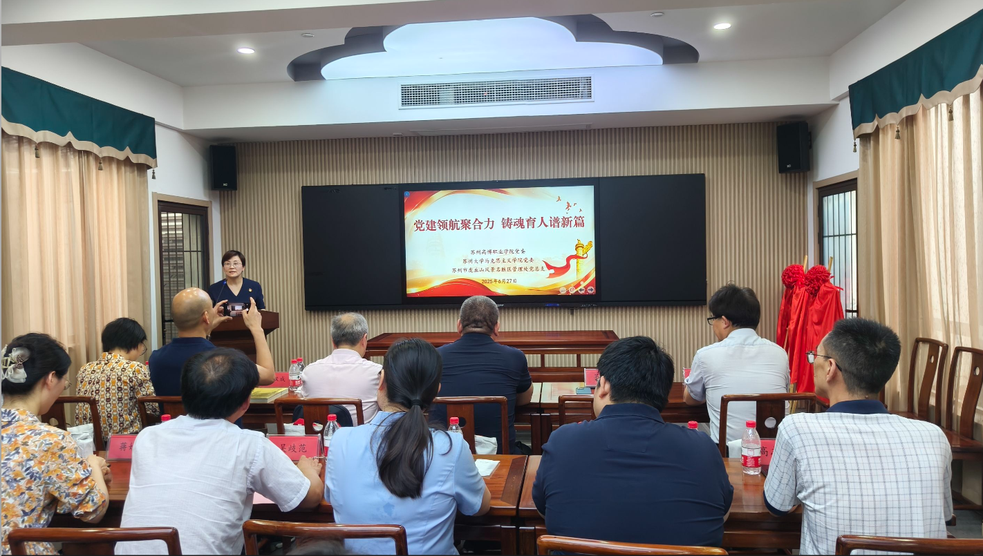 苏州大学马克思主义学院党委书记茅海燕在致辞中表示,苏大马院与高博职业学院、虎丘景区有着深厚的合作基础。2019年,学院教师就曾参与铁铃关战斗史料研究与布展工作,此次的共建是红色缘分的延续、是前期合作的深化。她介绍,苏州大学马克思主义学院此前已与苏州市博物馆、革命博物馆等共建8个实践基地,拍摄4000余部微视频打造“行走的思政课”。学院近年来连续四次获评江苏省高校示范马克思主义学院,此次与虎丘景区的合作,是其构建“百馆育人”矩阵的关键一环;苏大马院拥有多个省级以上研究基地,在党建与思政教育领域成果丰硕。学院教师第五党支部由骨干教师组成,构建了“理论+实践+文化”三位一体的思政育人模式,此次合作将推动红色资源与思政教育深度融合,打造独具特色的“大思政课”实践教学品牌。
