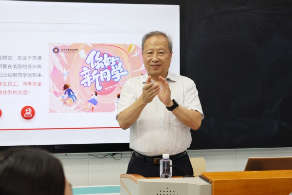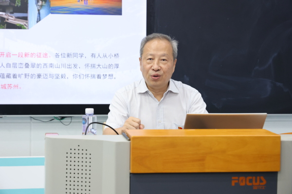薛书记首先代表学校对来自全国各地的新同学表示热烈欢迎,并介绍了苏州深厚的历史文化底蕴与蓬勃的现代发展活力,以及学校近年来在内涵建设、特色发展上取得的显著成就。他指出,2025年是新中国成立76周年,也是中国人民抗日战争暨世界反法西斯战争胜利80周年,新时代青年要铭记历史、缅怀先烈、珍爱和平、开创未来。