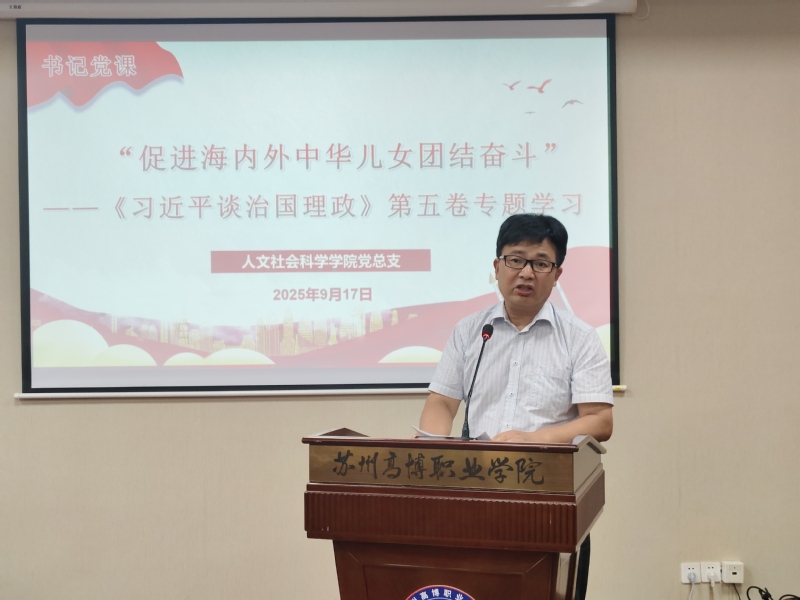 2025年9月17日下午,人文社会科学学院组织全体教职工开展政治理论学习会,围绕“促进海内外中华儿女团结奋斗”——《习近平谈治国理政》第五卷专题进行深入学习。本次学习会由院党总支书记吴建明主讲。