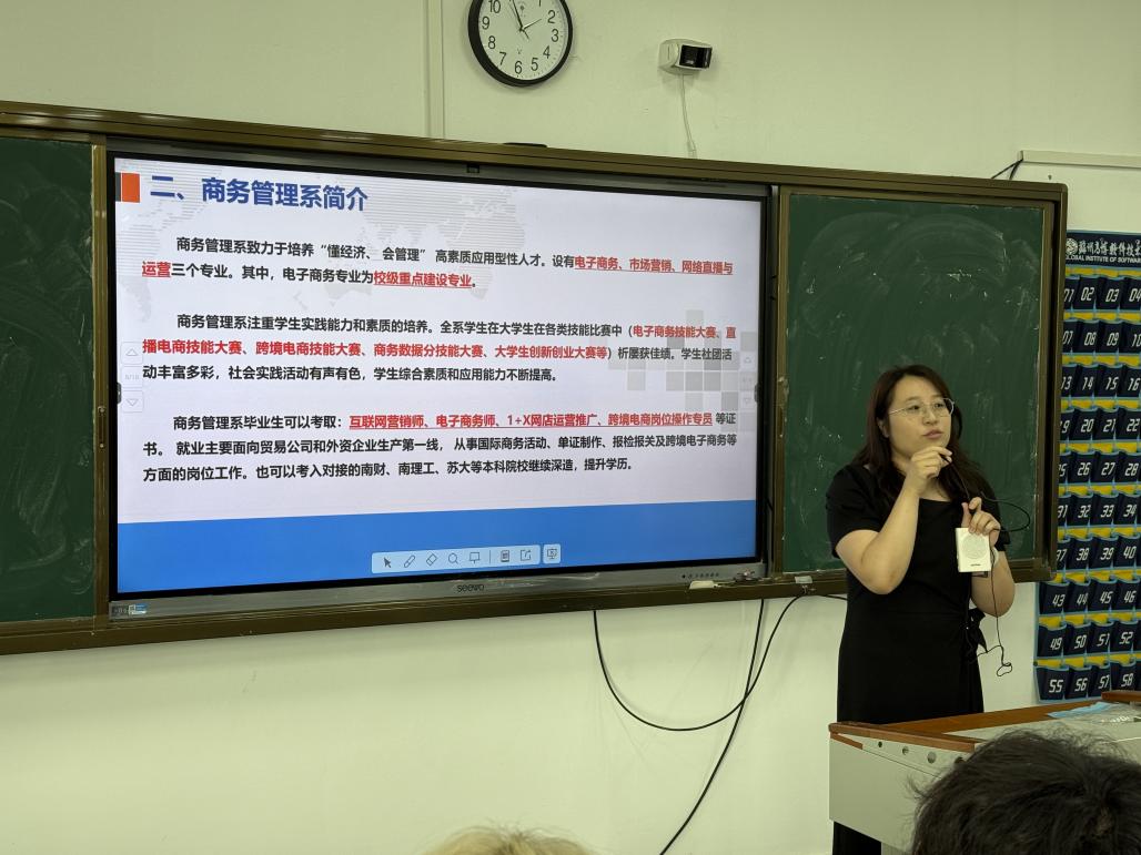 最后,商务管理系副主任成凤老师聚焦专业学习,开展了专业介绍与人才培养方案讲解。她从电子商务专业群的特色出发,详细介绍了专业的教学体系、师资力量与实训环境,围绕比赛考证、职业发展等新生关心的话题,分享了专业相关的技能竞赛、职业资格证书报考方向,学历提升通道等,并介绍了大学三年的课程设置、学习内容与考核要求,不仅让新生对专业有了更全面的认知,更帮助他们树立了清晰的学习规划意识,为后续三年的专业学习奠定了坚实基础。