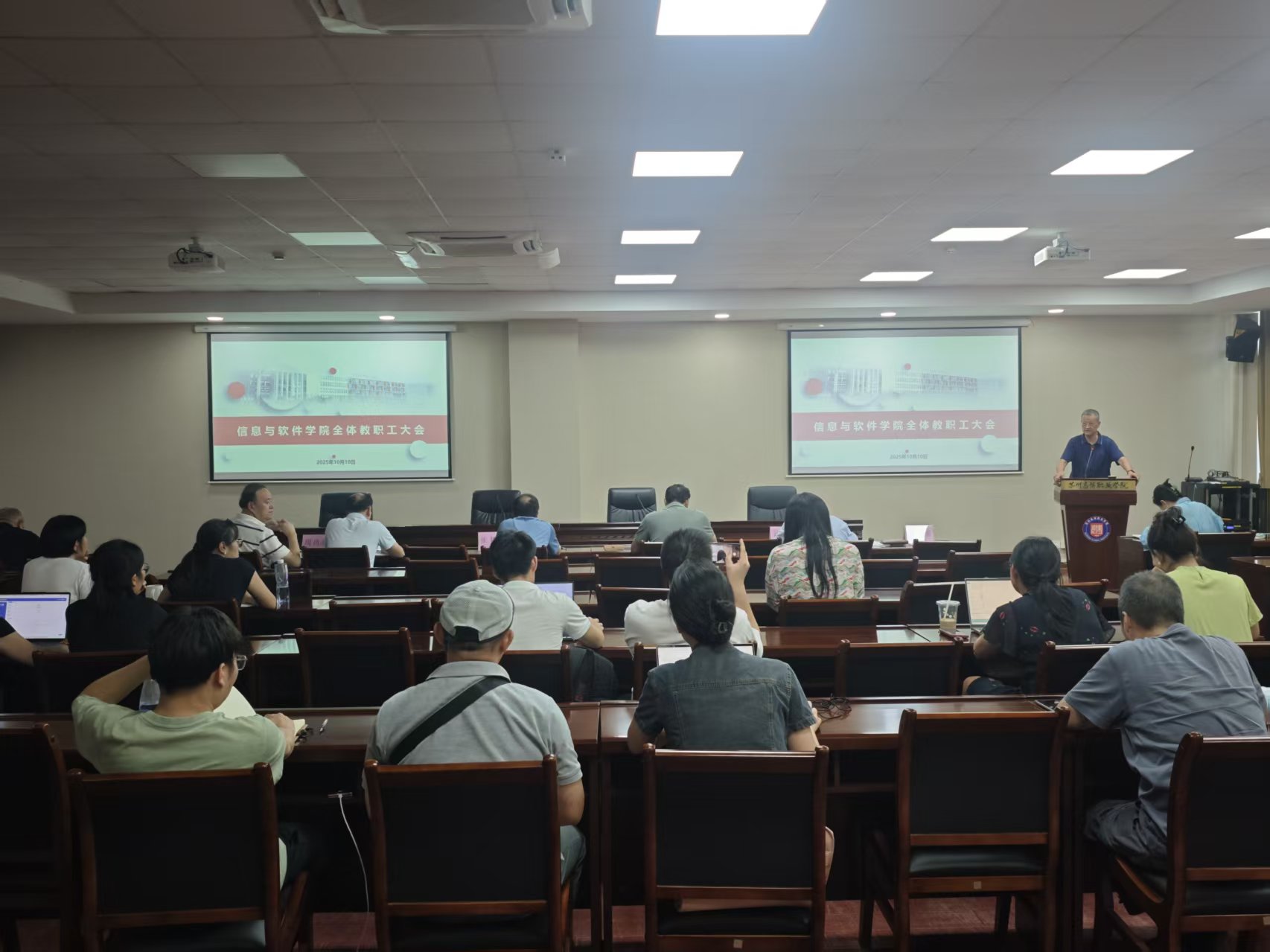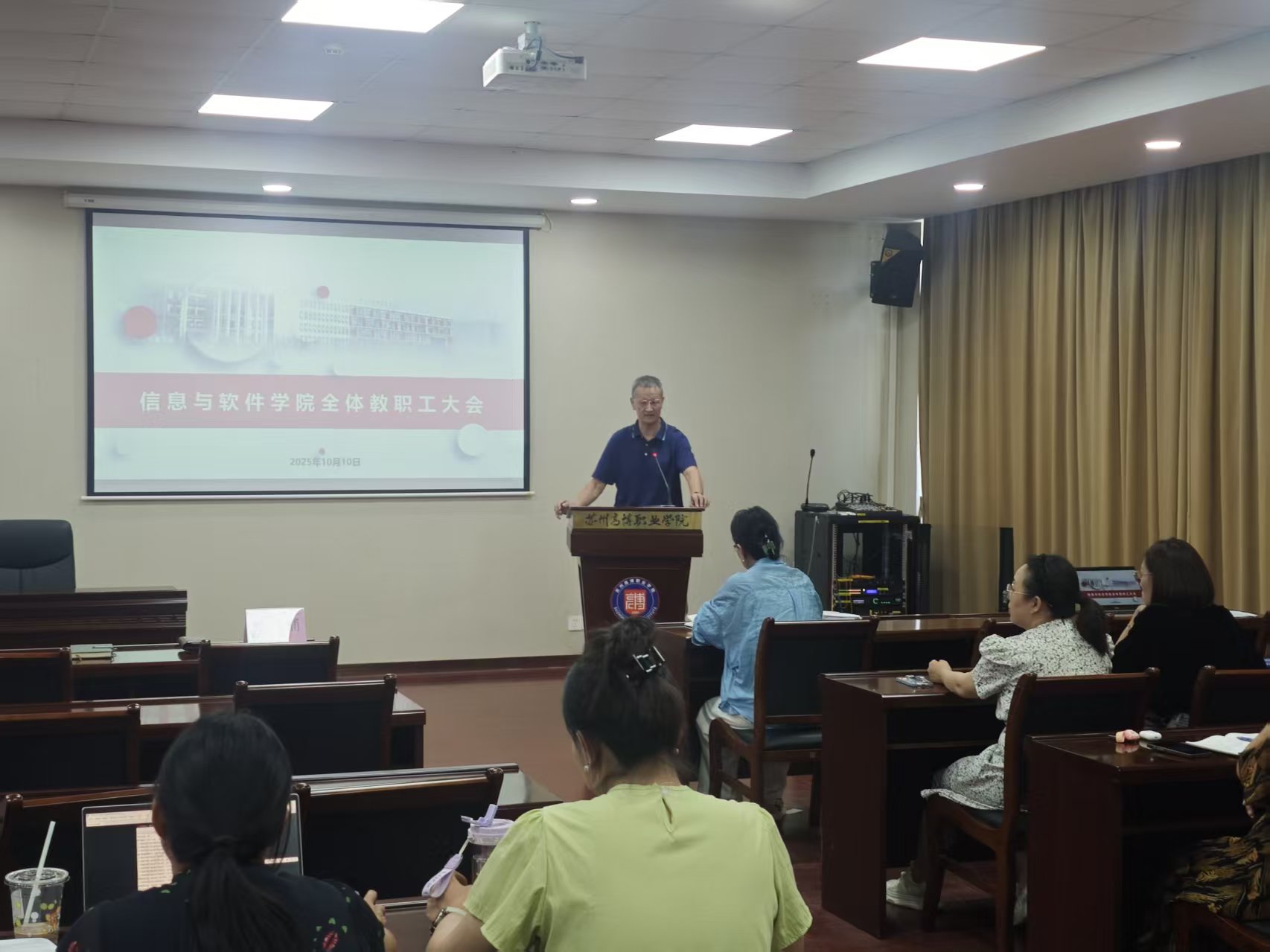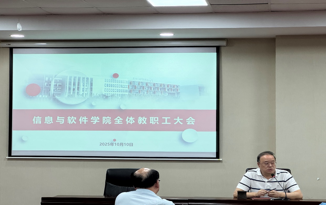 2025 年10月10日下午2点,信息与软件学院于14-215会议室隆重召开全体教职工大会,深入探讨学院发展现状,规划未来发展方向。本次会议由孙涌院长主持,学院领导班子成员及全体教职工参加。