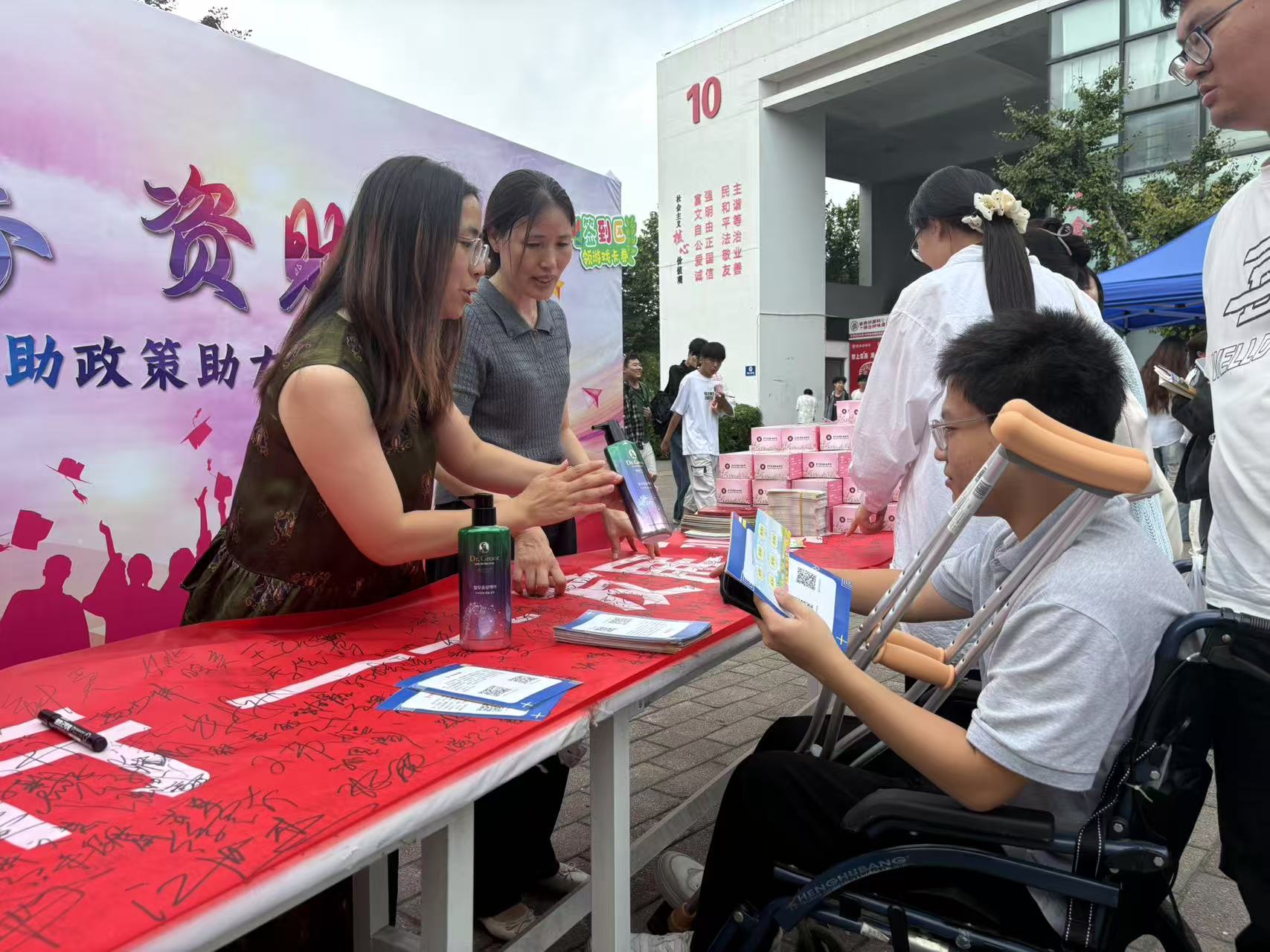 本次活动同步设立“一对一政策咨询台”,资助管理中心老师围绕发展型资助政策核心内容细致解读,涵盖国家奖助学金的申报条件、评审标准与发放流程。针对部分学生关注的“家庭经济困难学生认定材料准备”“校内资助与国家助学贷款如何衔接”等重点问题,资助中心老师们结合政策文件与往年案例,进行“手把手”指导,确保每位咨询学生都能“带着疑问来,揣着答案走”。现场志愿者则主动发放资料、引导咨询,扩大政策覆盖范围,让精准服务的“温度”传递到校园每个角落。