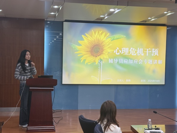 接着,由健康中心专职教师郭燕进行学校危机干预文件解读。郭燕老师从日常管理、危机干预、工作提醒等方面深入剖析危机干预文件的制定背景、核心条款与实施流程。结合校园常见危机场景,讲解危机识别、预警、处置的具体方法与注意事项,强调危机干预工作的重要性与规范性,引导辅导员树立危机意识,掌握科学有效的危机应对策略,进一步提升学校危机防范与处置能力,为维护校园安全稳定与学生健康成长保驾护航。