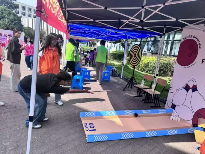 为切实做好学生资助工作,让资助政策深入人心,2025年10月15日,苏州高博职业学院于二食堂广场开展资助政策宣传活动,医学院在活动现场设置了“瞄准,发射!你的快乐全中!”趣味保龄球互动游戏,吸引了众多学生积极参与。