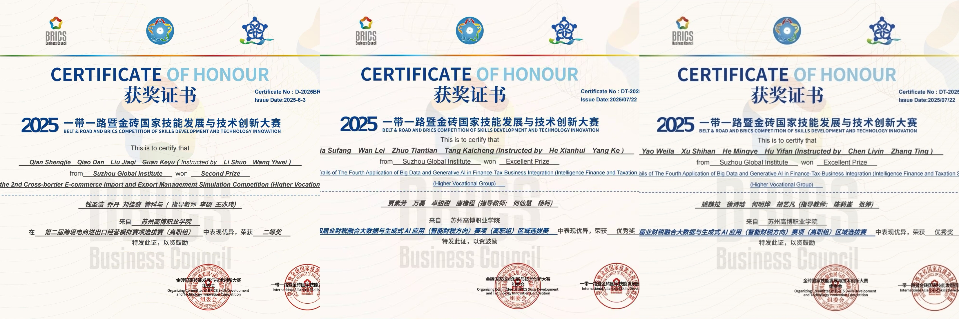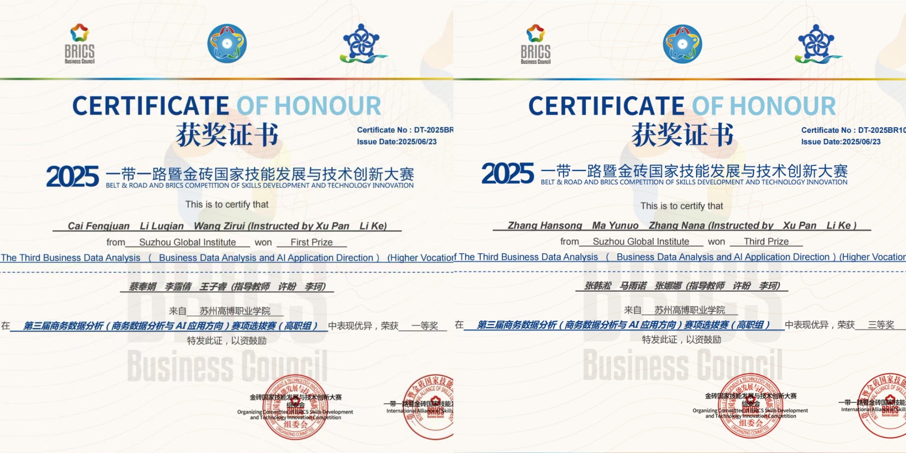 近日,“2025年一带一路暨金砖国家技能发展与技术创新大赛”各大赛项成绩相继揭晓。经过前期的精心遴选和学院领导的统筹组织,我校国际商学院共选派队伍参加了7个赛项的角逐,学院学子凭借扎实的专业技能、出色的创新能力和稳定的临场发挥,在比赛中脱颖而出,共斩获一等奖1项、二等奖3项、三等奖5项、优秀奖3项,累计参赛达44人次,创下学院参与本项赛事的历史最好成绩,展现了在高素质技术技能人才培养方面的显著成效。