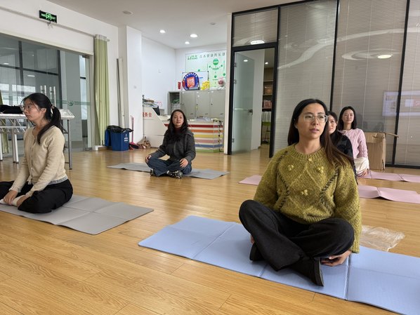 本次活动将传统养生功法八段锦与现代瑜伽练习相结合,旨在为老师们提供科学有效的放松途径。活动于9时30分准时开始。在专业人员的指导下,参与者首先进行了八段锦基础动作的体验学习,通过舒缓的动作与规律的呼吸配合,达到调和气血、放松身心的效果。随后进行的瑜伽放松练习,侧重于身体拉伸、呼吸调整与冥想静心,帮助老师们进一步释放紧张情绪,缓解疲劳。