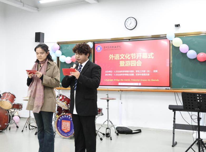 11月12日下午,由校学生工作部(处)、校团委和人文社会科学学院外语系联合主办,人文社会科学学院分团委、乐学外语俱乐部共同承办的2025年外语文化节开幕式暨游园会在32-101教室成功举办。本届外语文化节以“Languages Bridge the World, Potential Knows No Bounds”为主题,旨在打造一个融语言学习、文化体验与跨文化互动于一体的校园文化平台。校特聘教授洪庆福、国际交流合作处处长陆惠星、党委工作部宣传干事刘昶彤、公共外语教研室主任刘洋、专业外语教研室主任张凤、人文社会科学学院分团委书记吴敬德及全校各院系师生代表、留学生共同出席了开幕式活动。活动由人文学院教师陈灵霏和2471应用英语班学生陈海平主持。