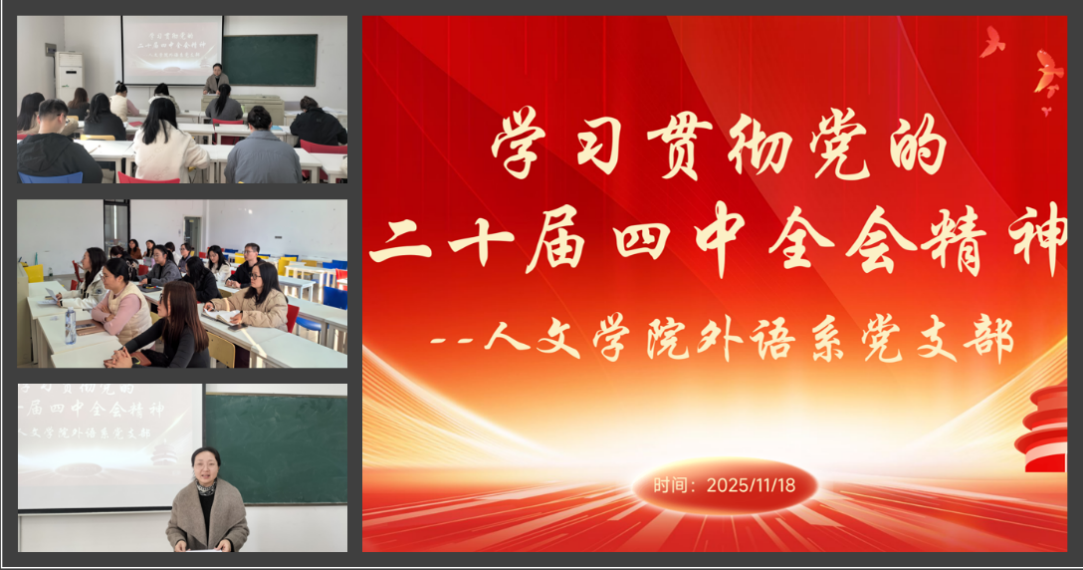 11月18日,人文学院外语系党支部举行“学习贯彻党的二十届四中全会精神”主题党日活动。本次活动由支部宣传委员马乐乐主持并领学,全体党员参加。