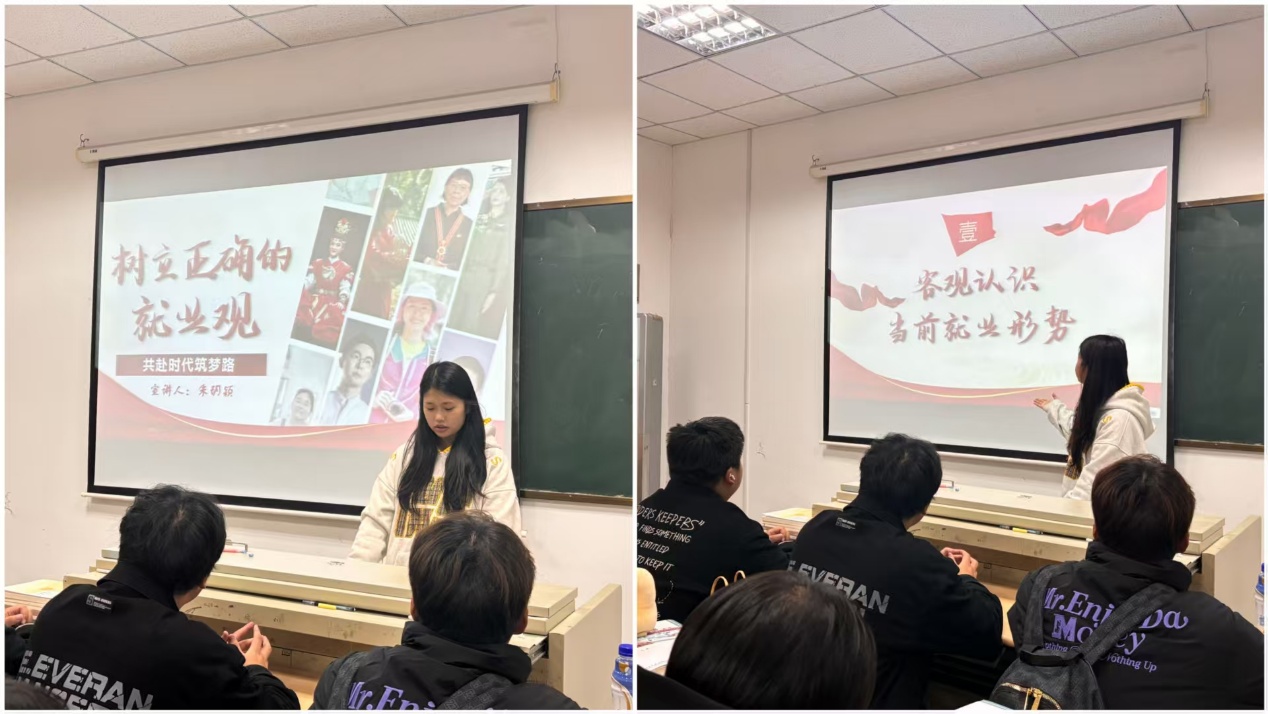 近日,人文社会科学学院面向全体在校学生开展了一场“以青春之我锚定就业航向”信仰公开课,学院2024级学生代表朱玥颖担任主讲人,围绕就业形势、就业观内涵、价值意义及实践路径展开分享,为学子送上兼具数据支撑与思想引领的就业指导。