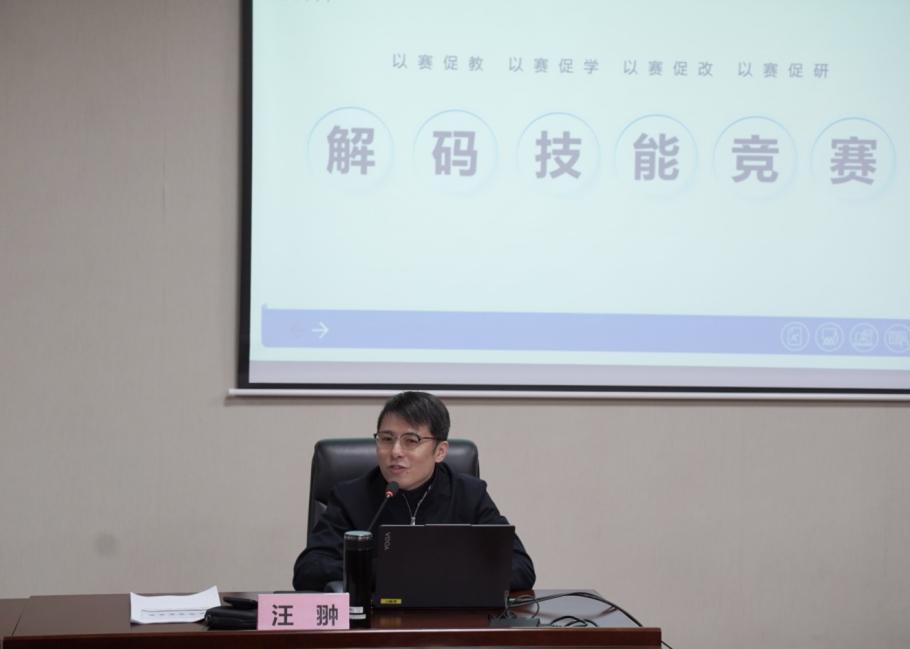 汪翀副处长长期从事高校竞赛指导管理工作,对校级、省级、世界职业院校技能大赛及各类教学大赛的政策体系、评审标准有着深入研究和丰富经验。讲座中,他首先系统梳理了当前各级竞赛的整体布局与发展趋势,从竞赛申报条件、流程规范、资源支持等核心维度,对校级竞赛的组织机制、省级竞赛的选拔标准以及世界学生技能大赛的备赛要点进行了分层解读,重点厘清了不同级别竞赛之间的衔接逻辑与申报关键节点。