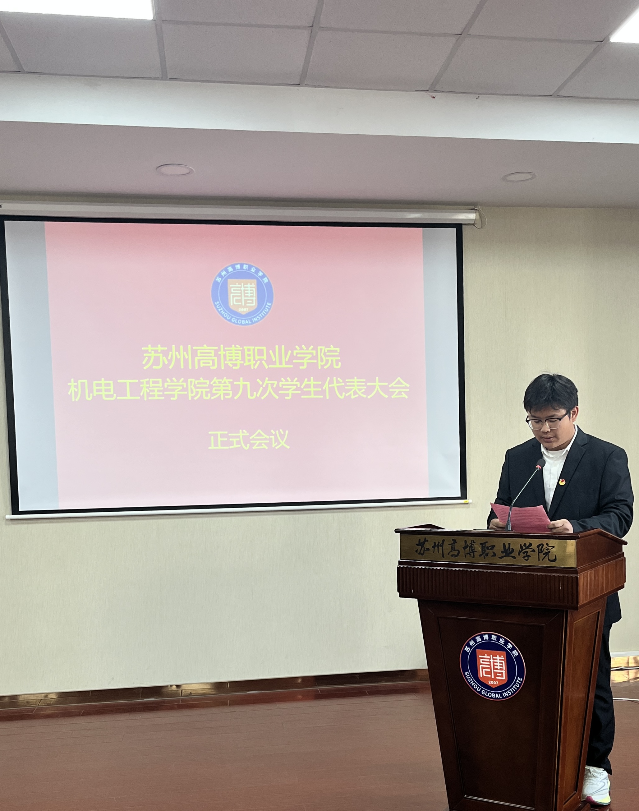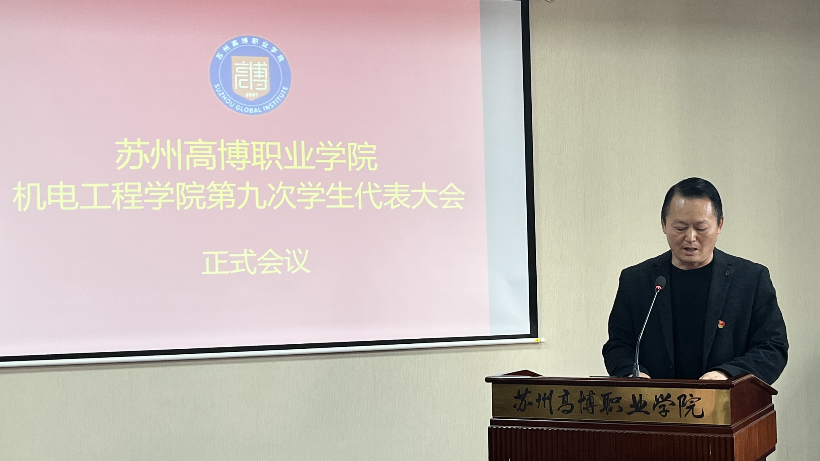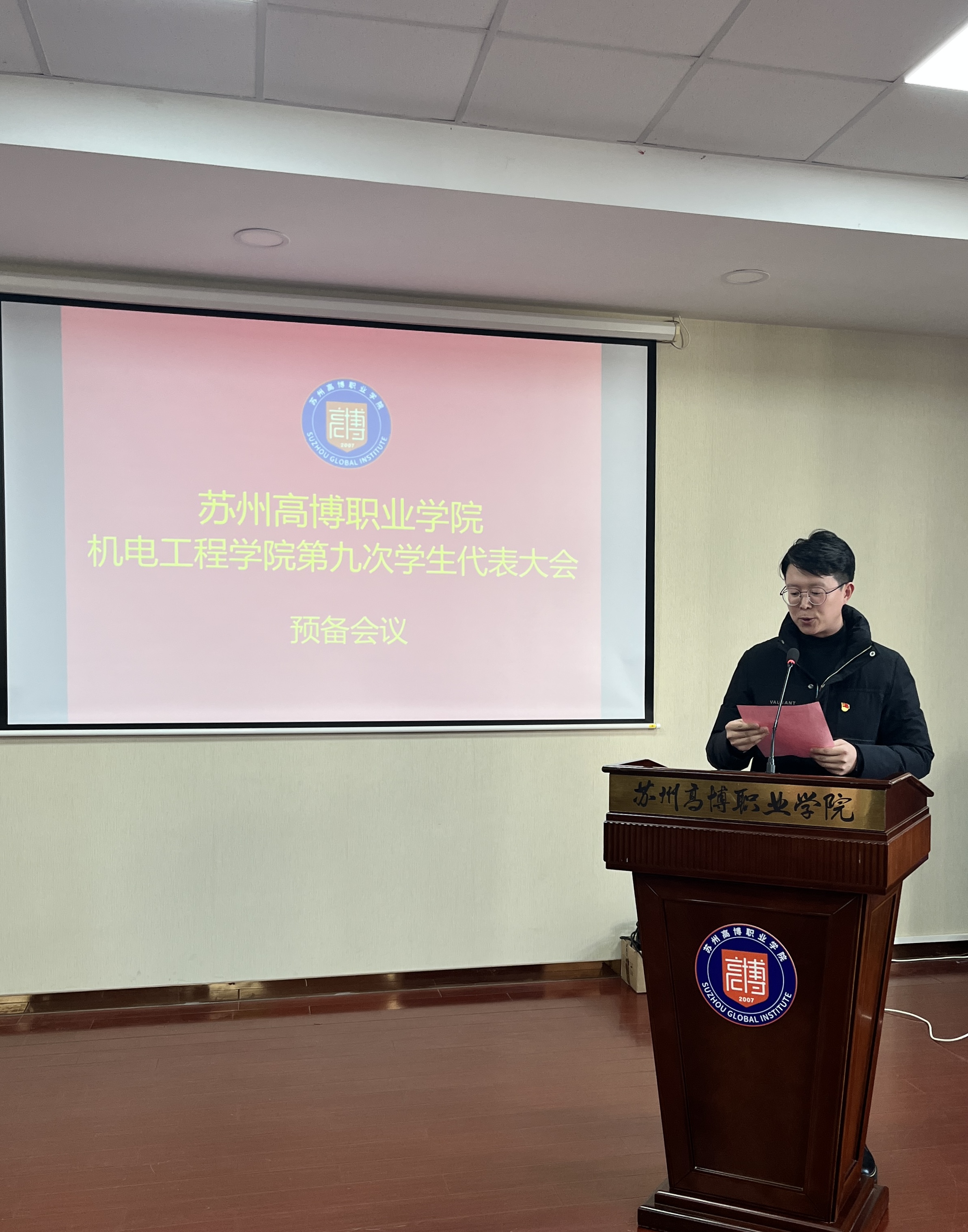 在校团委的关怀指导和学院党总支的正确领导下,在学校各部门和广大青年学生的大力支持下,经过精心筹划和准备,苏州高博职业学院机电工程学院第九次学生代表大会于2025年11月20日下午1:00在行政楼215学术报告厅顺利召开。机电工程学院党总支副书记、副院长陈粟裕、学工办主任王一迪、分团委书记施云、全体辅导员及36名学生代表出席会议。大会由袁思梦同学主持。