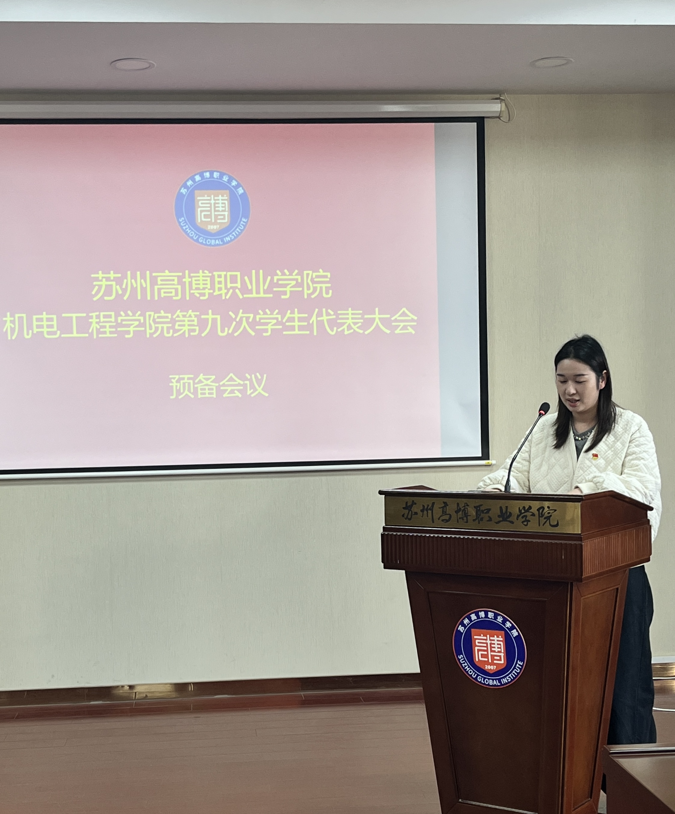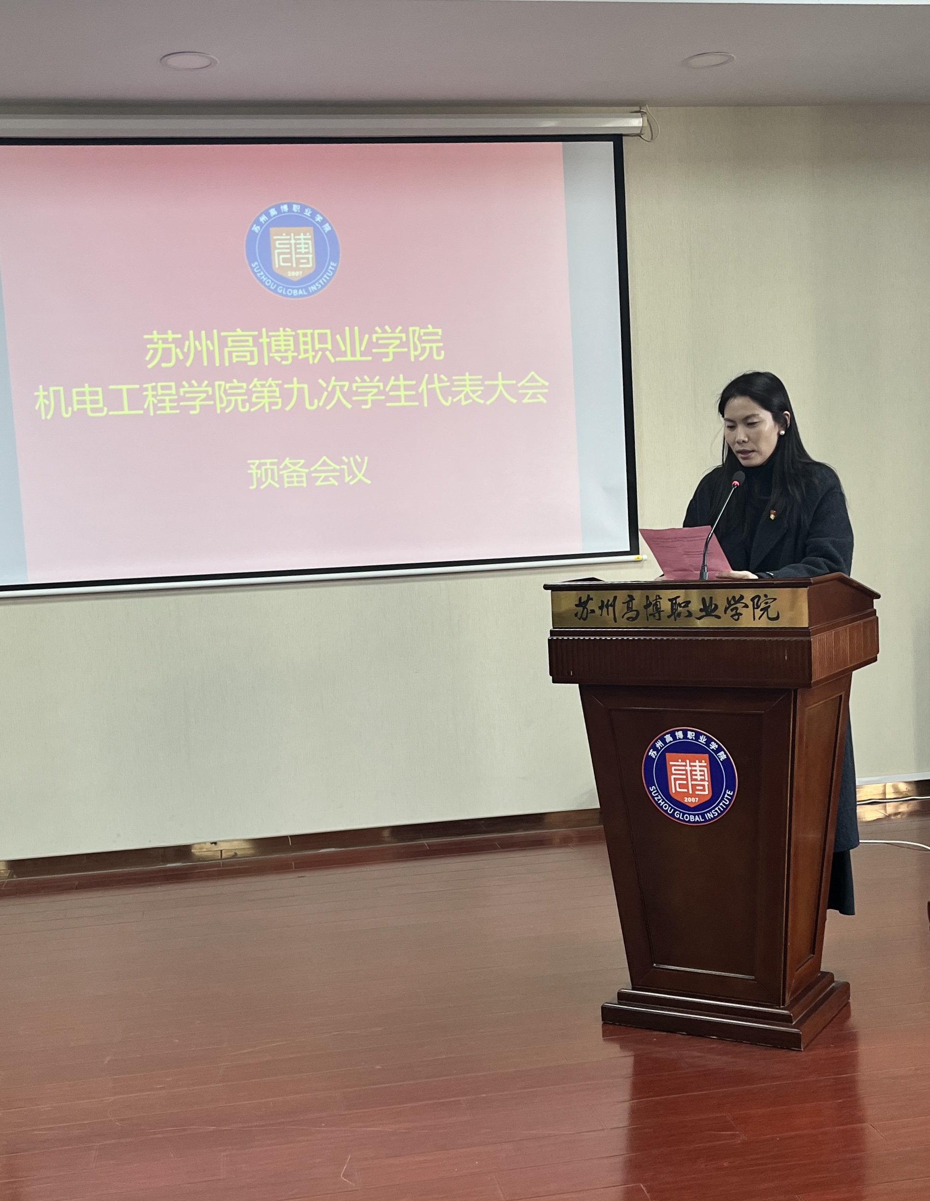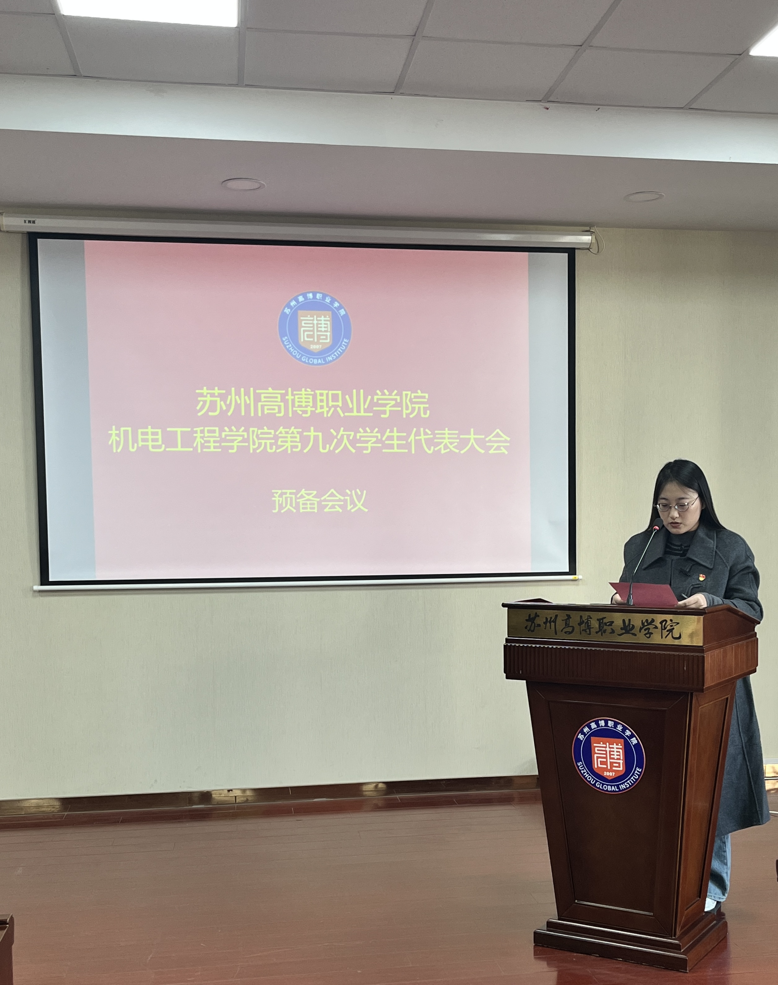 在校团委的关怀指导和学院党总支的正确领导下,在学校各部门和广大青年学生的大力支持下,经过精心筹划和准备,苏州高博职业学院机电工程学院第九次学生代表大会于2025年11月20日下午1:00在行政楼215学术报告厅顺利召开。机电工程学院党总支副书记、副院长陈粟裕、学工办主任王一迪、分团委书记施云、全体辅导员及36名学生代表出席会议。大会由袁思梦同学主持。