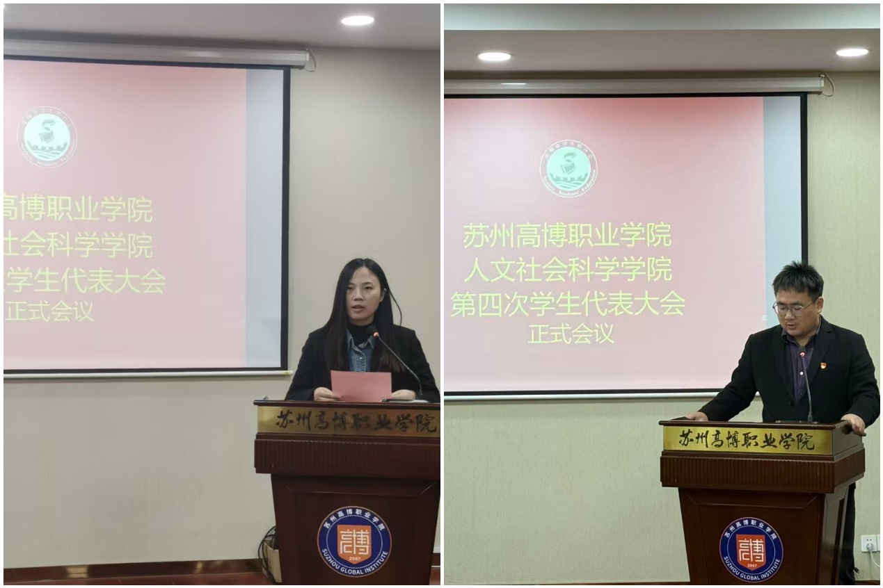 苏州高博职业学院人文社会科学学院第四次学生代表大会近日隆重举行。学院党总支副书记、副院长赵雪飞,分团委书记吴敬德出席会议,44名学生代表齐聚一堂,以青春担当为学院学生工作高质量发展注入新动能。