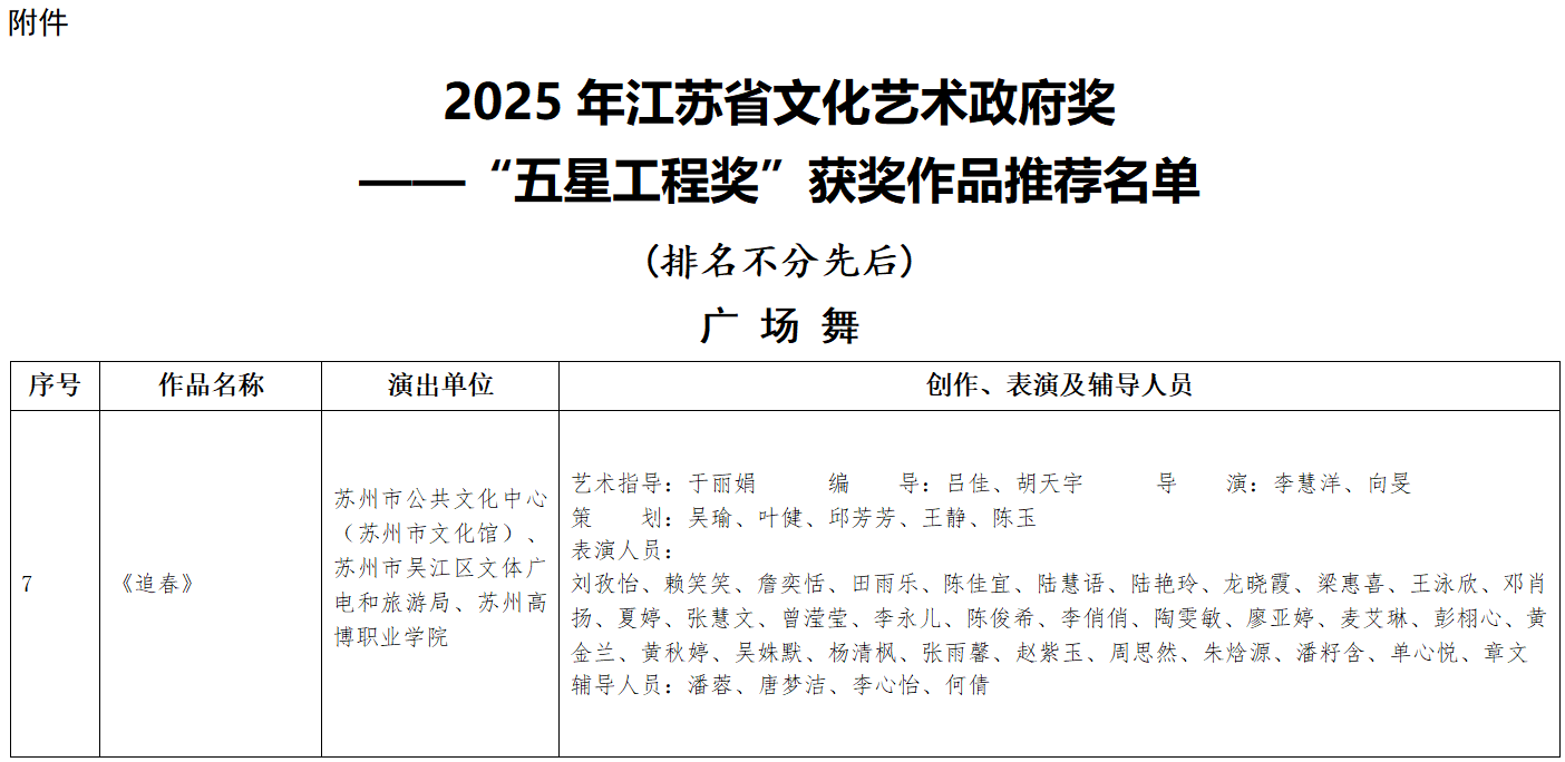 日前,江苏省文化和旅游厅正式公布了2025年江苏省文化艺术政府奖——“五星工程奖”获奖作品推荐名单。我校参与创作并组织学生表演的舞蹈作品《追春》闪耀终评舞台,荣获江苏省“五星工程奖”。