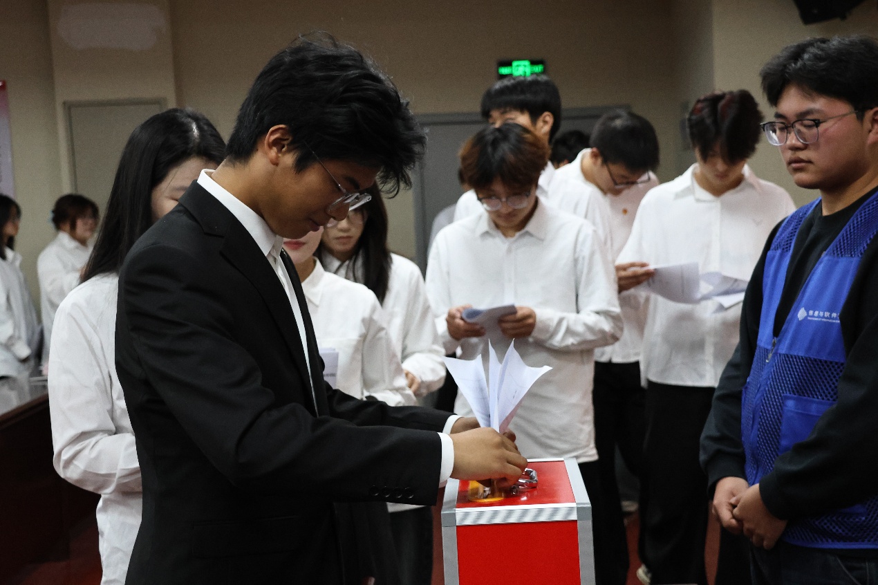 选举环节,首先由殷旺同学、姚宇航同学、王天佑同学、陈香怡同学向各代表发放选票,其次各个代表开始认真填写,随后将填写好的投票单放入计票箱,选举产生了信息与软件学院第十八届学生会主席团成员以及出席苏州高博职业学院第九次学生代表大会的代表,整个过程有组织有纪律,最后由刘若涵老师担任总计票人、张启珩同学担任计票人,确保了此次选举结果的真实性。