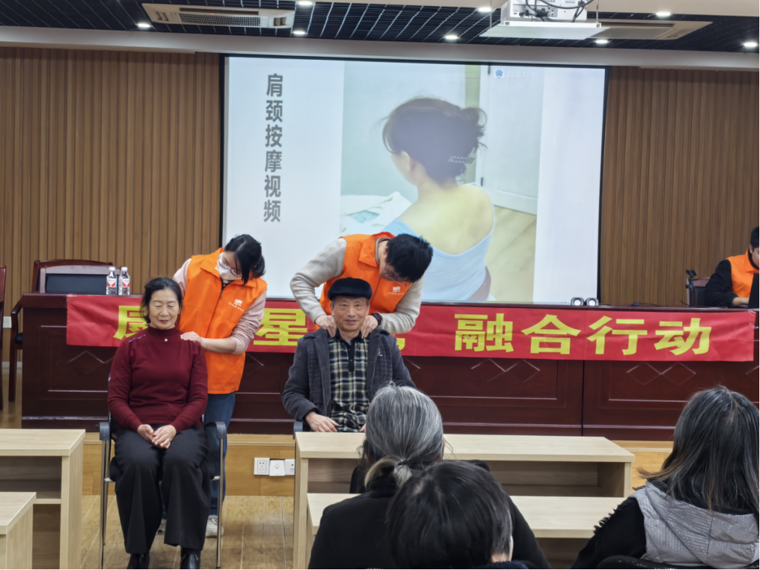活动当日,志愿服务活动在社区正式启动。医学院康复系负责人带队统筹,学生党员志愿者主动亮身份、作表率,全程主导活动组织与服务开展。在宣教环节,学生党员代表围绕“残疾三级预防”理念,常见运动损伤的应急处理等内容,用通俗易懂的语言讲解了日常生活中的康复防护要点。针对社区老年居民肩颈腰不适高发的现状,党员志愿者现场示范上肢穴位按摩技巧与简易保健操,手把手指导居民掌握动作要领,让“居家康复”知识真正走进百姓生活。