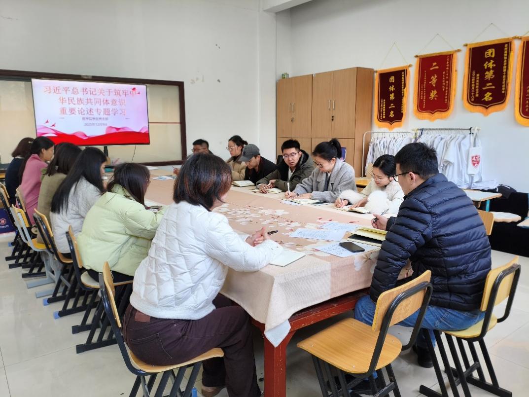 为深入学习贯彻习近平总书记关于加强和改进民族工作的重要思想,牢牢把握铸牢中华民族共同体意识这一新时代党的民族工作主线,12月9日医学院学生党支部举行专题学习会,全体党员同志共同感悟思想伟力、凝聚奋进共识,推动民族工作高质量发展。