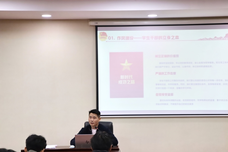 12月3日晚6时,学生骨干专题培训会第二课在行政楼215举行。会议围绕“以作风促作为 以实干显担当”主题展开,旨在引导学生骨干明确使命、夯实作风、提升能力,更好融入学校工作格局。本次培训由校团委副书记蒋运奇主讲,校院两级学生会骨干参与本次学习。