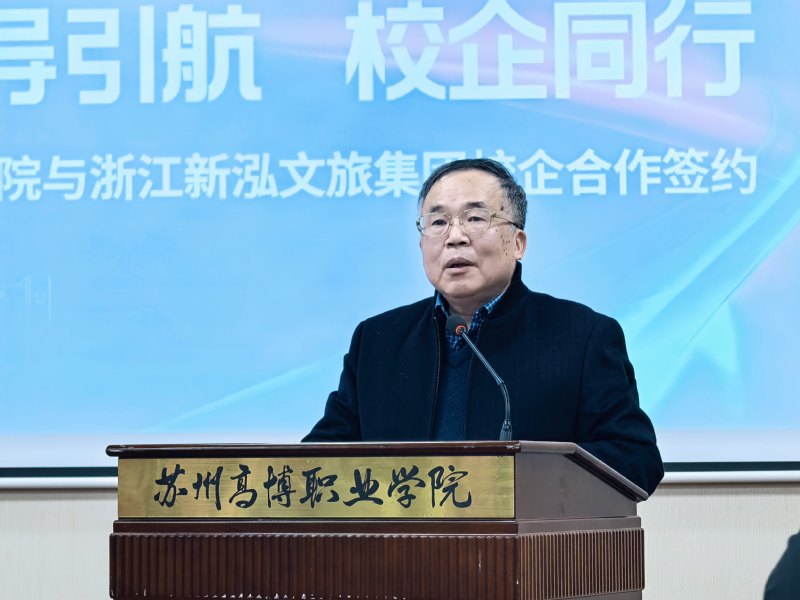 徐子良副书记代表学校向浙江新泓文旅集团表示感谢,高度认可新泓集团“企业大爱赋能教育”的责任担当。他希望借助“校企双导”机制,让学生在真实项目实践中提升技能、涵养情怀,真正实现“教学—实践—就业”的无缝衔接。