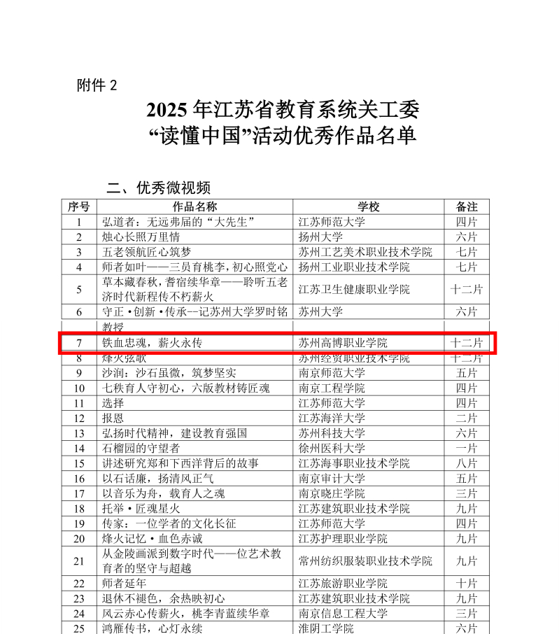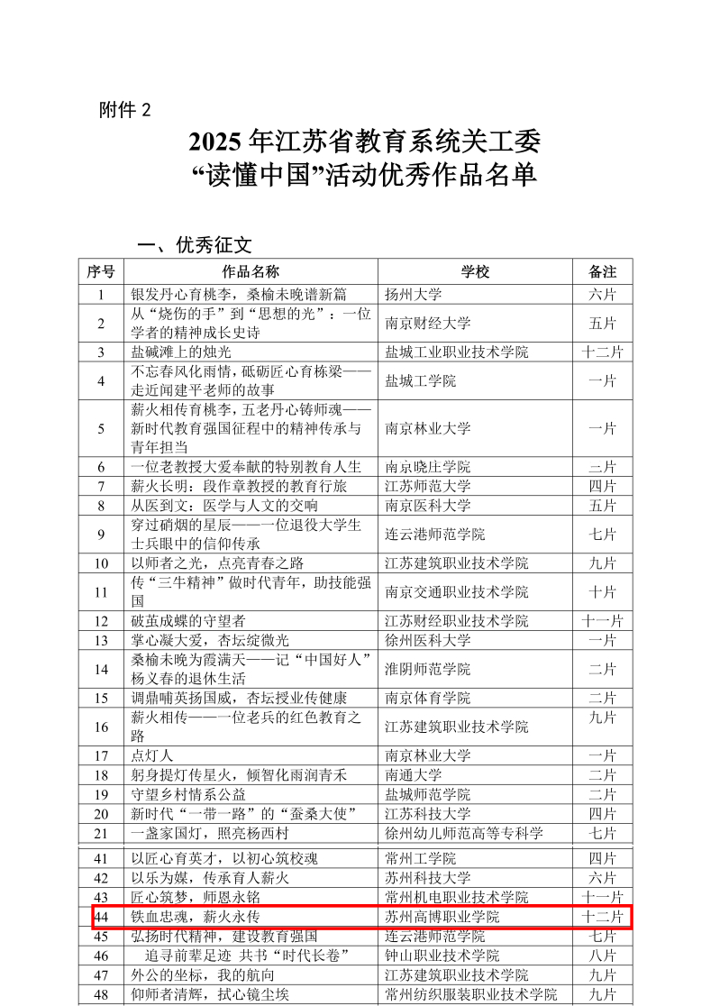 近日,教育部关工委发布了《关于公布2025年“读懂中国”活动入选作品名单的通知》(教关委函〔2025〕15号),我校关工委因组织得力、成绩突出获评“表扬单位”。同时,江苏省教育系统关工委也发布了《关于公布2025年“读懂中国”活动入选作品名单的通知》(苏教关委〔2025〕13号),我校关工委推荐上报的征文《铁血忠魂,薪火永传》入选2025年江苏省教育系统关工委“读懂中国”活动优秀征文;微视频《铁血忠魂,薪火永传》入选2025年江苏省教育系统关工委“读懂中国”活动优秀微视频。