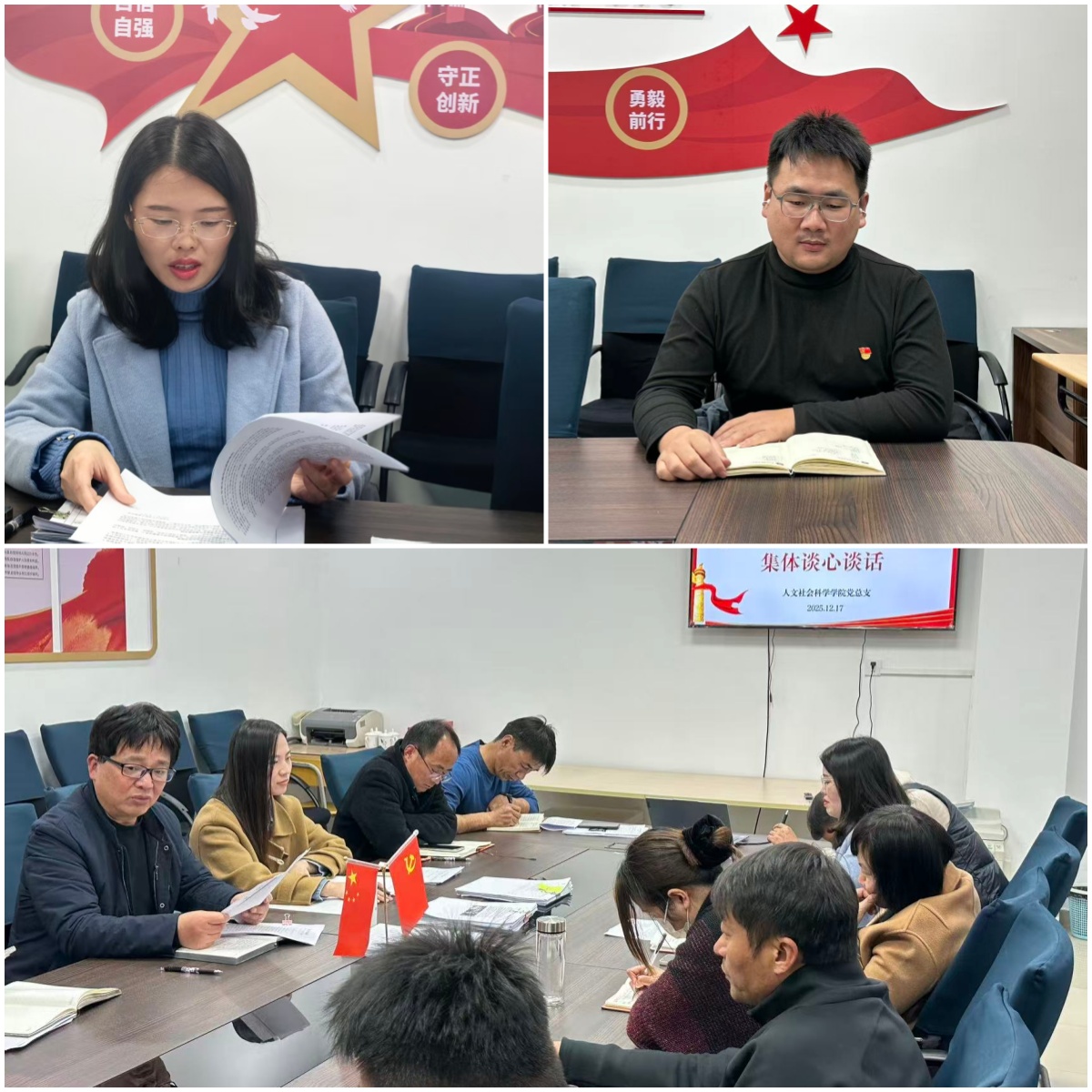 为进一步加强基层党组织建设,压实党建工作责任,近日,人文社会科学学院党总支严格遵循规定程序,顺利完成了学生党支部成立及外语系党支部、马克思主义学院党支部、基础部党支部换届选举等工作。12月17日,学院党总支召开新一届党支部书记、委员集体谈心谈话会,凝聚思想共识、明确工作方向。校长助理、学院党总支书记吴建明,全体总支委员及新一届党支部书记、委员参加会议,会议由党总支副书记赵雪飞主持。