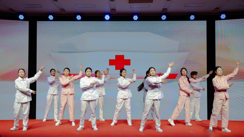 在第一篇章中,情景舞剧《初心》以护理学子白衣为甲、逆行守护生命的动人场景,诠释了“敬佑生命、甘于奉献”的职业信仰与匠心坚守;朗诵《百年交响》以铿锵之声回溯百年征程,激荡起师生对党的忠诚与对民族复兴的坚定信念;现代舞《东方红》将经典旋律与当代舞美巧妙融合,让红色记忆在青春律动中焕发新生;走秀《大美华夏》则以华服为媒,展现中华传统服饰之美,彰显青年一代的文化自信与传承自觉。