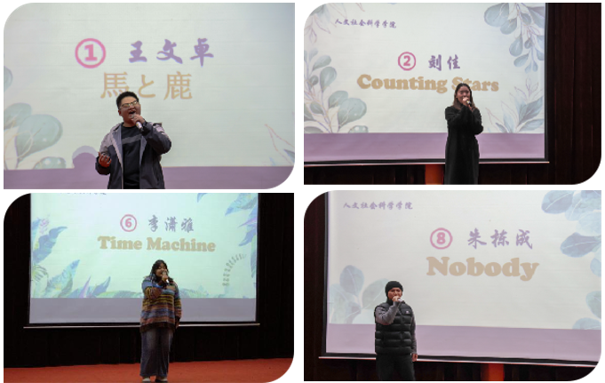 随后,外语歌曲大赛决赛正式拉开帷幕。经过初赛层层选拔,共有8位实力选手脱颖而出,成功站上决赛舞台。现场氛围热烈,选手们轮番登台,用英语、日语演绎经典曲目。他们将精湛的歌唱技巧、扎实的语言功底与真挚情感完美融合,或婉转诠释深情,或活力点燃全场,精彩表现赢得评委认可与观众阵阵掌声,现场气氛高潮迭起,充分展现了我校学子的外语素养与艺术风采。