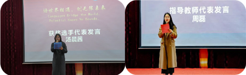 颁奖仪式后,获奖选手代表汤晨茜上台发言,她首先对学校、学院及指导老师的悉心栽培表示诚挚感谢,同时分享了外语学习的感悟,坦言将以此次获奖为契机,持续深耕外语学习,不断提升跨文化交流能力。优秀指导老师周磊作为教师代表点评活动,她高度赞扬了同学们在活动中的积极参与热情与精彩表现,肯定了大家在赛事中展现出的扎实外语功底与鲜活的跨文化表达力,同时鼓励同学们以文化节为纽带,保持对语言学习的热爱,在实践中不断提升外语应用能力。