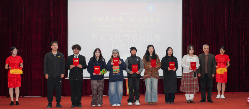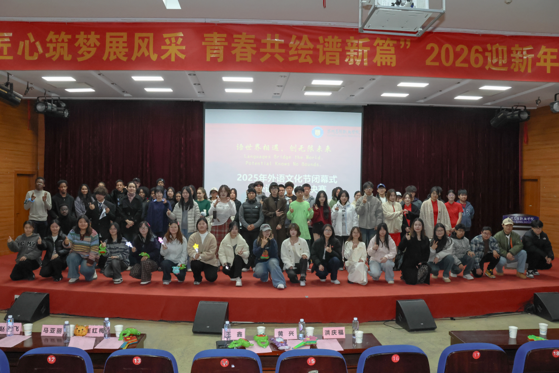 由人文社会科学学院主办、乐学外语俱乐部承办的2025年外语文化节闭幕式暨外语歌曲大赛决赛于12月19日下午在学校报告厅顺利举行。校长助理、人文社会科学学院院长黄兴,学生工作处副处长、校团委书记王鑫,特聘教授洪庆福,人文社会科学学院副院长马亚丽,公共外语教研室主任刘洋和专业外语教研室主任张凤,人文社会科学学院分团委书记吴敬德及外语系全体教师、乐学外语俱乐部成员和部分学生代表出席活动。