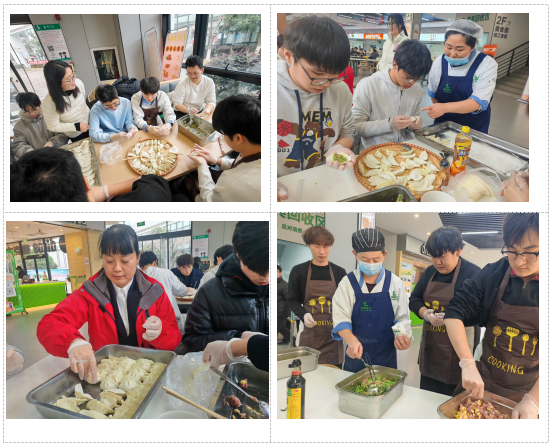 下午四点,活动正式开始。食堂工作台上整齐摆放着各种馅料。“饺子馅要顺着一个方向搅拌,这样口感才劲道。”后勤王师傅一边示范一边讲解。同学们认真聆听,跃跃欲试。